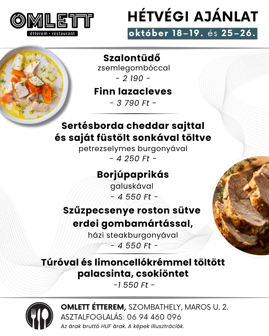 A gazdag ízek továbbra is a főszerepben: két egymást követő hétvégén is házias, mégis különleges fogásokkal várunk mindenkit az Omlett Étteremben Szombathelyen. A klasszikus magyar konyha legjobb fogásait párosítottuk egy kis nemzetközi inspirációval.