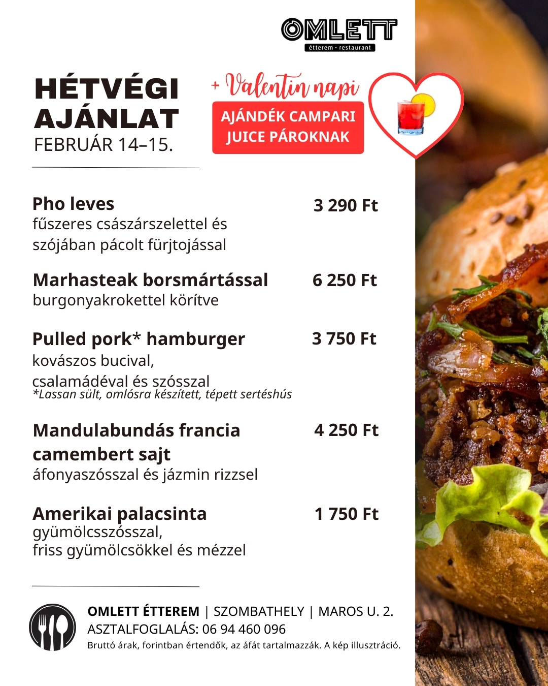 Ezen a hétvégén is különleges fogásokkal várjuk vendégeinket Szombathelyen, a Maros utcában. A menüsorban ezúttal egy ázsiai ihletésű leves, tartalmas húsételek és egy klasszikus desszert kapott helyet. Valentin-nap alkalmából a páros vendégeinket egy pohár Campari juice-szal kínáljuk.