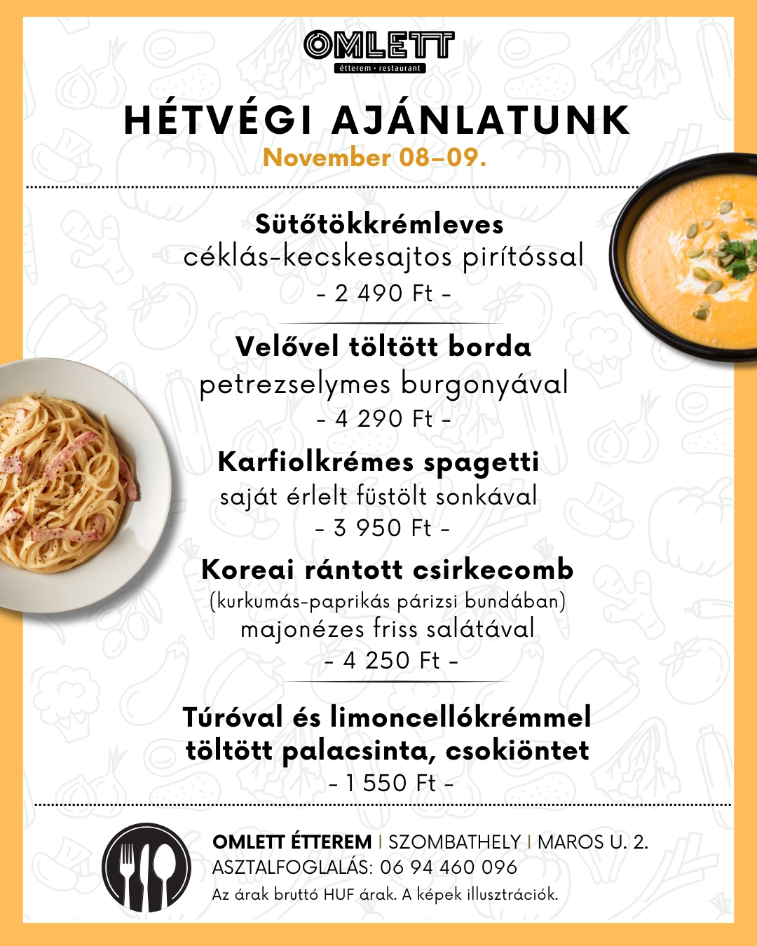 November első két hétvégéjén sem maradhatsz finom falatok nélkül! Az Omlett Étterem izgalmas, menüsorral vár Szombathelyen, a Maros utca 2. szám alatt.