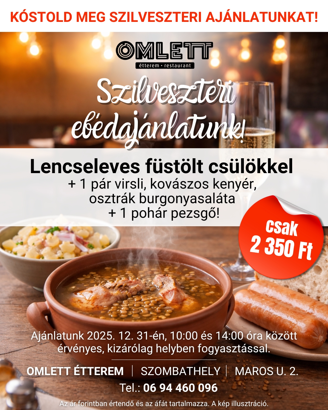 Az év utolsó napján sokan ragaszkodnak a hagyományokhoz – mi pedig örömmel segítünk ebben. 2025. december 31-én, szerdán 10:00 és 14:00 óra között szilveszteri ebédajánlattal várjuk vendégeinket az Omlett Étteremben, Szombathelyen.